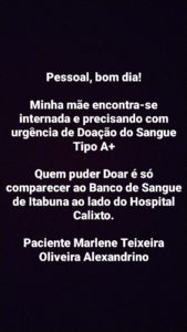 A senhora Marlene Teixeira Oliveira Alexandrino está passando por problemas de saúde e necessita urgentemente de doação de sangue. Aqueles que puderem ajudar, devem se dirigir ao Banco de Sangue da Santa Casa de Misericórdia, e informar que querem fazer doação a dona Marlene Teixeira. Desde já, agradecemos a todos que puderem ajudar!