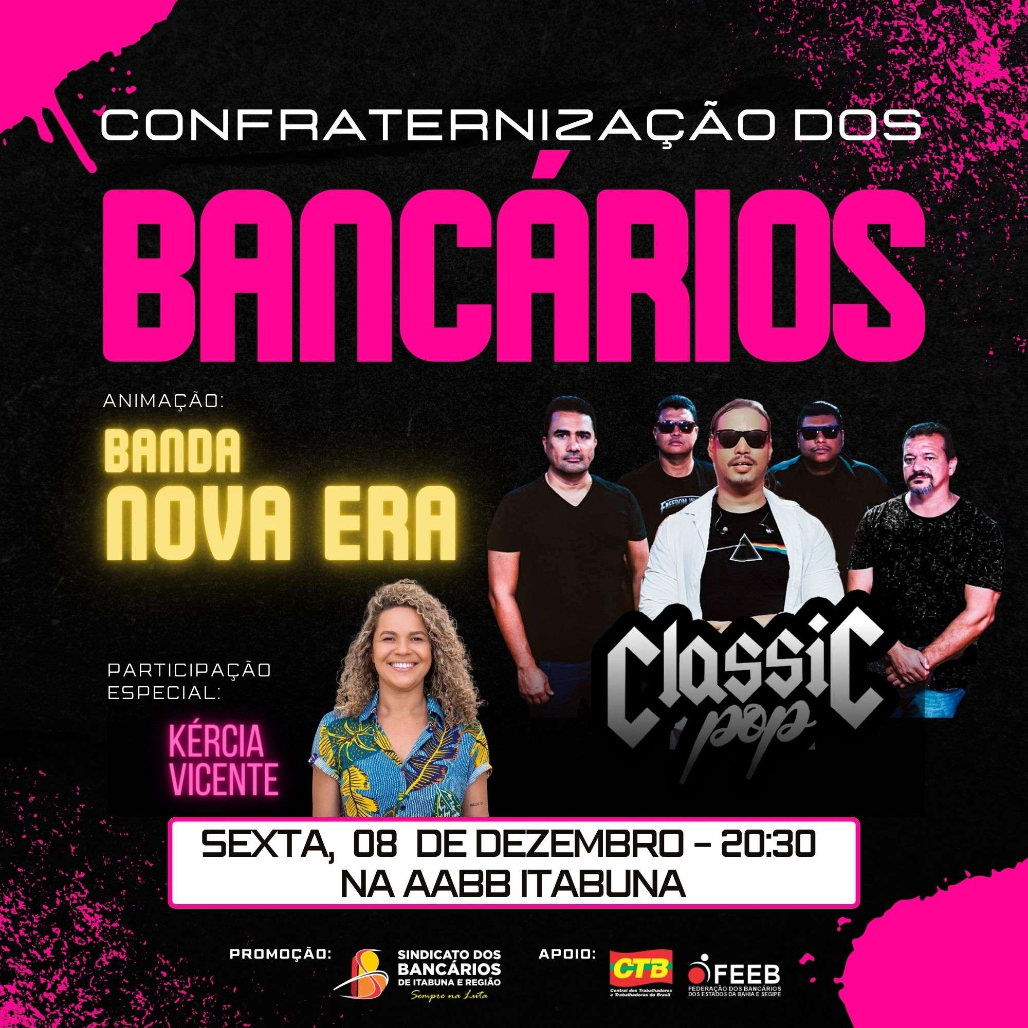 Nossa festa acontece hoje, a partir das 20h30min, na AABB de Itabuna. A parte musical ficará por conta das bandas Nova Era (com participação especial de Kércia Vicente) e Classic Pop. Ou seja: é certeza de que a noite vai ser bem animada!