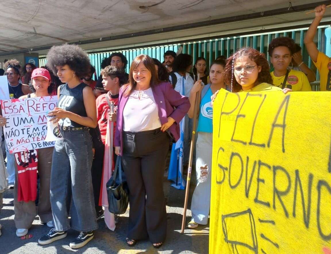 Nesta terça-feira (19), representantes de diversas entidades da educação, entre elas a APLB-Sindicato e CNTE, promoveram um ato em Brasília em oposição ao Novo Ensino Médio. A mobilização resultou no anúncio feito pelo deputado José Guimarães (PT-CE), líder do governo na Câmara, informando o adiamento da votação do projeto de lei que estabelecerá as diretrizes para a Política Nacional de Ensino Médio para março de 2024. O adiamento da votação do projeto foi resultado de uma articulação com o ministro da Educação, Camilo Santana (PT), e o relator da proposta, o deputado Mendonça Filho (União-PE). A Central dos Trabalhadores e Trabalhadoras do Brasil (CTB) marcou presença, com a secretária de Políticas Educacionais e diretora da APLB-Sindicato, Arielma Galvão.