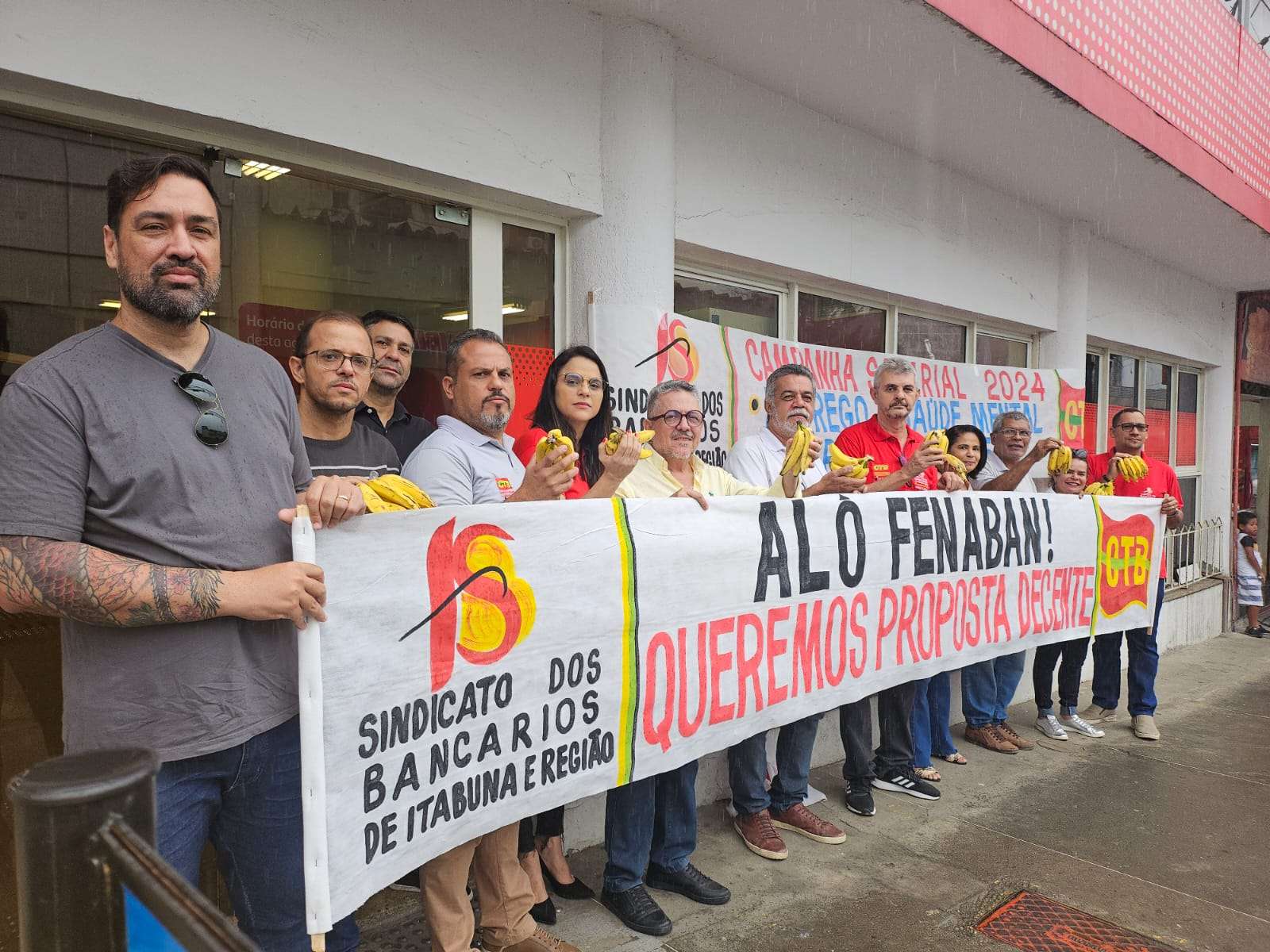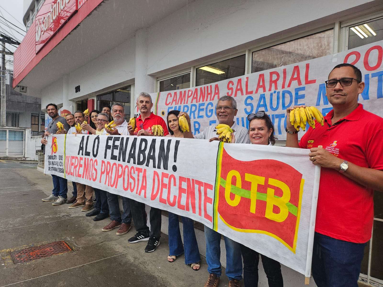 Na manhã desta quinta-feira (15/8), os bancários de Itabuna realizaram uma paralisação de duas horas na agência do Santander, segurando bananas como forma de protesto. O ato, que contou com a presença de diversos trabalhadores, simboliza a indignação dos bancários diante do tratamento que estão recebendo da Fenaban. O gesto de “devolver as bananas” reflete o sentimento de desrespeito e frustração da categoria. A agência reabriu suas portas às 11h.