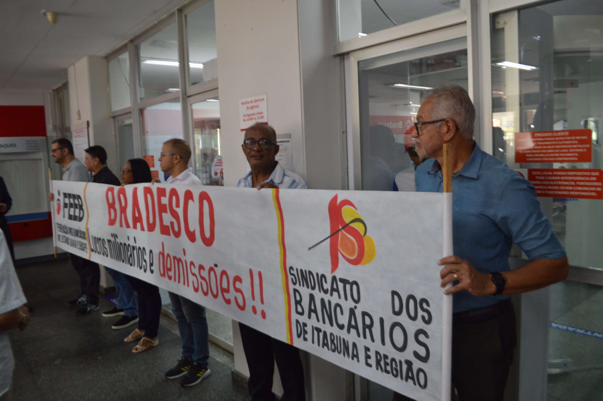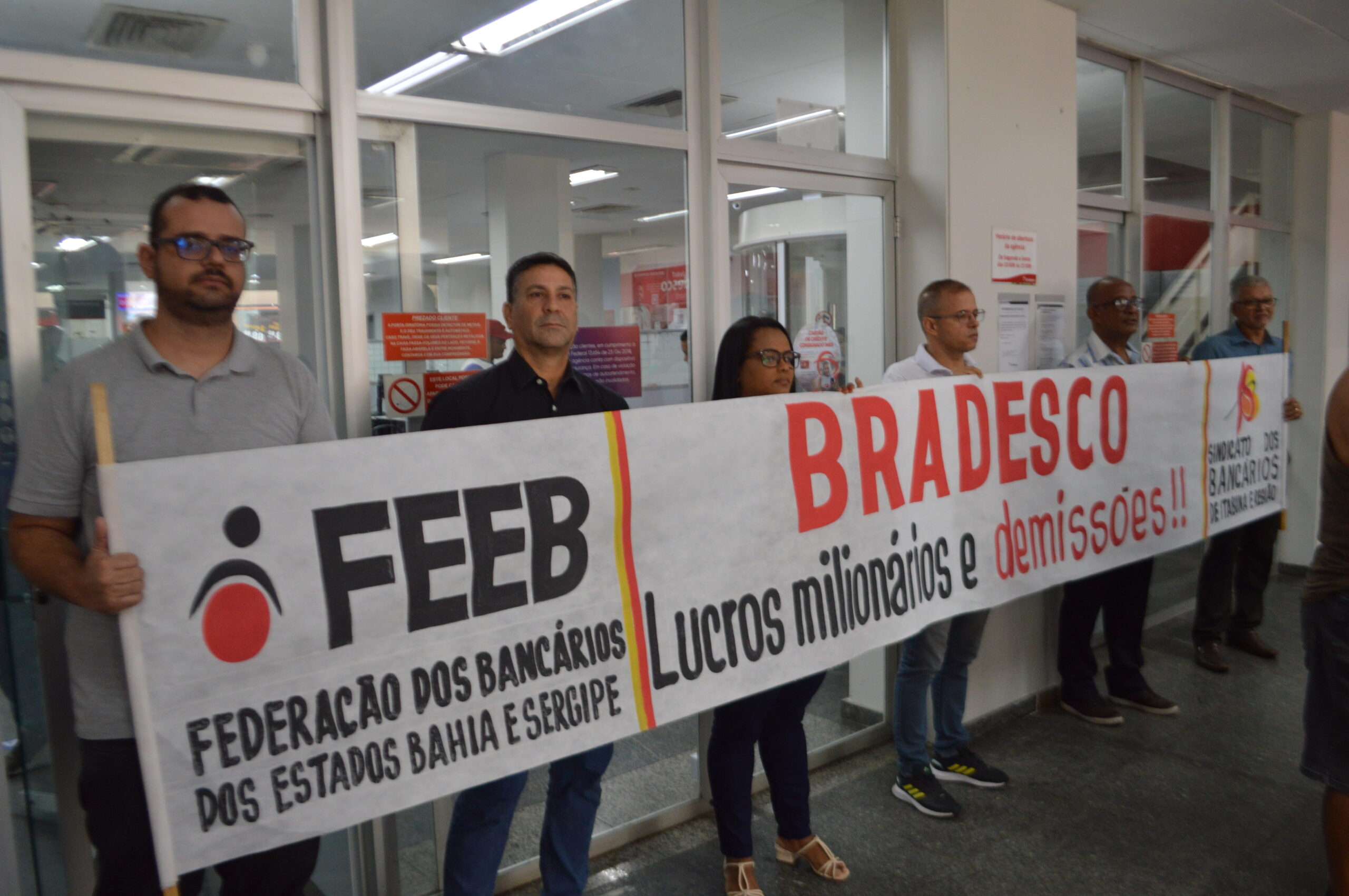 Por todos esses motivos, o Sindicato dos Bancários de Itabuna e Região, realizou na manhã desta terça-feira, 1 de abril, uma manifestação e paralisação de 30 minutos no Bradesco agência Itabuna, em crítica as demissões e o fechamento de agências, classificando-os como injustificáveis diante do alto lucro apresentado e das denúncias de sobrecarga de trabalho.