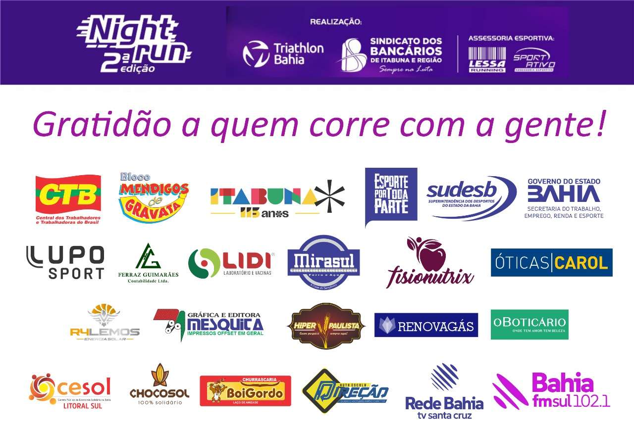 O evento só foi possível graças ao apoio do Governo do Estado da Bahia por meio da SETRE – SUDESB, Prefeitura Municipal de Itabuna, Polícia Militar, CTB Bloco Mendigo de Gravata, além de empresas e parceiros como Óticas Carol, Lidi Laboratório, Ferraz Guimarães Contabilidade, Físionutrix, Esporte Por Toda parte, Auto Escola Direção, Boi Gordo, Lupo, O Boticário, Hiper Paulista, R4LEMOS Energia Solar, RenovaGás, Bahia FM Sul e TV Santa Cruz.